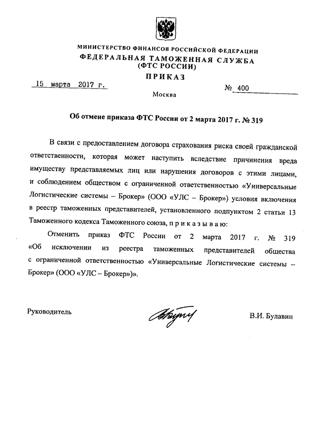 ПРИКАЗ ФТС РФ от 15.03.2017 N 400