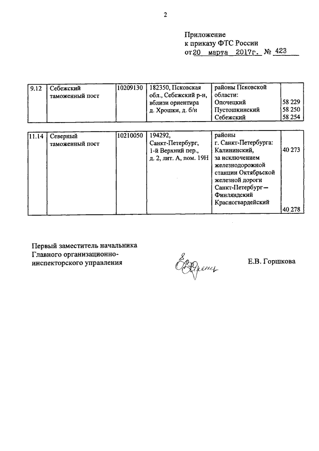 ПРИКАЗ ФТС РФ от 20.03.2017 N 423