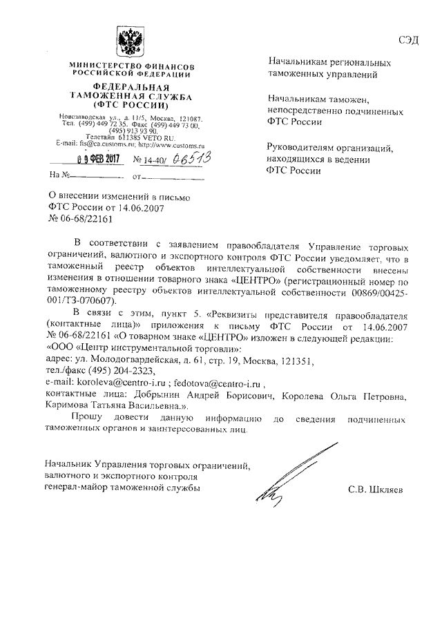 ПИСЬМО ФТС РФ от 09.02.2017 N 14-40/06513