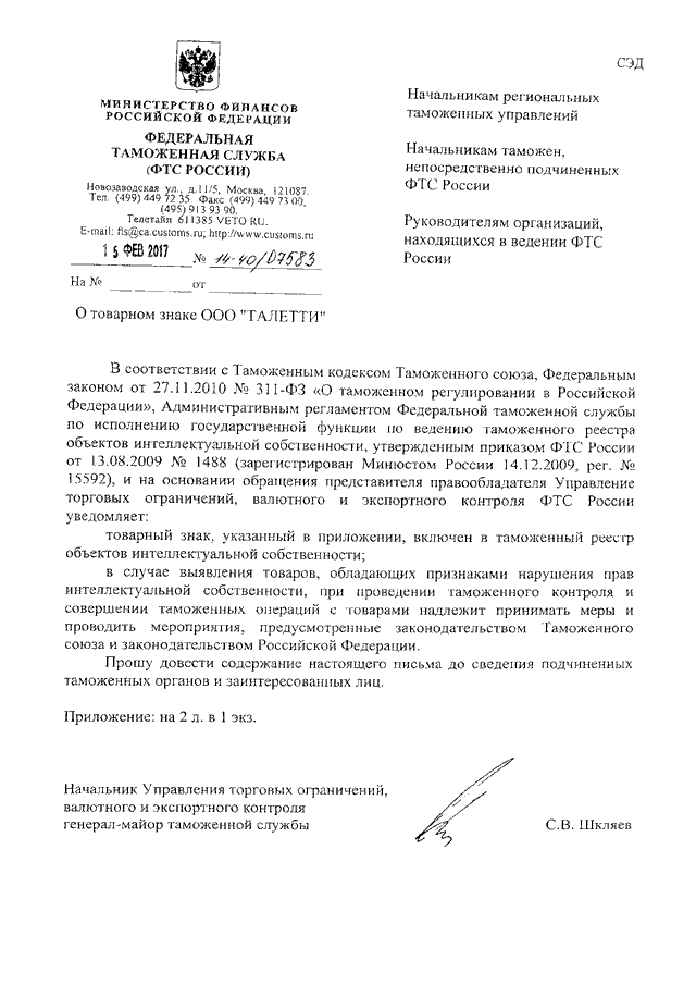 ПИСЬМО ФТС РФ от 15.02.2017 N 14-40/07583