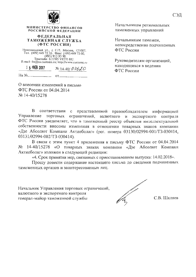 ПИСЬМО ФТС РФ от 15.02.2017 N 14-40/07620