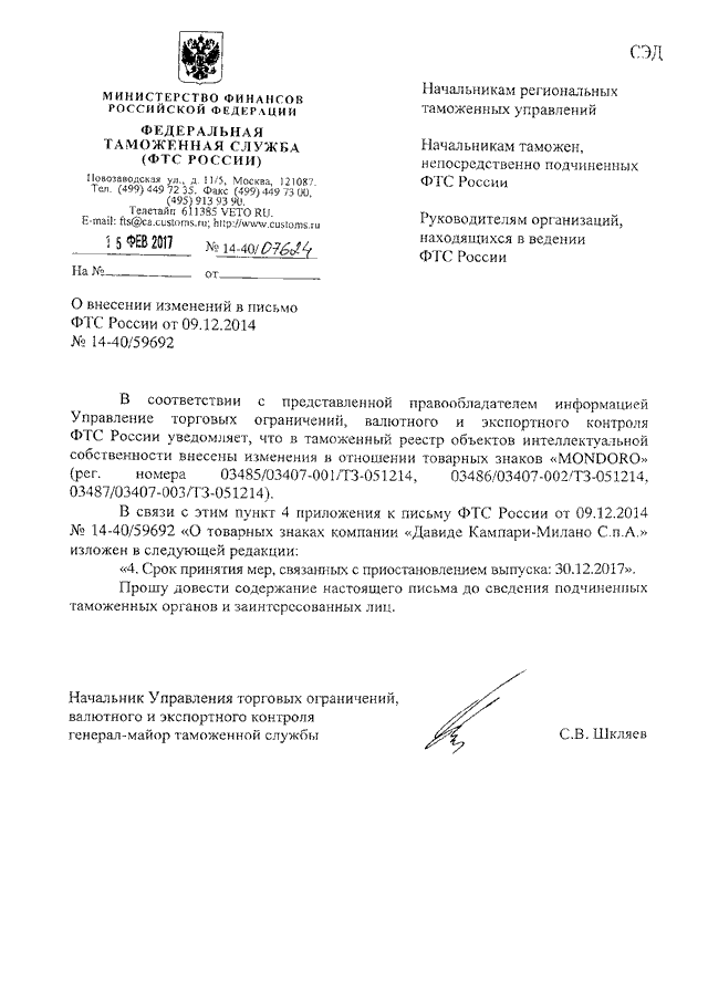 ПИСЬМО ФТС РФ от 15.02.2017 N 14-40/07624
