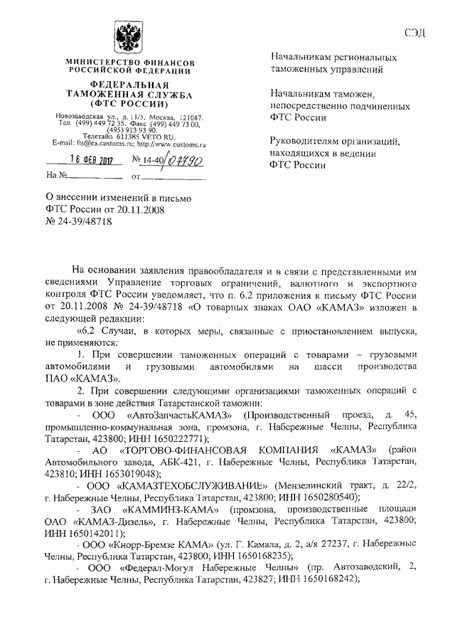 ПИСЬМО ФТС РФ от 16.02.2017 N 14-40/07790