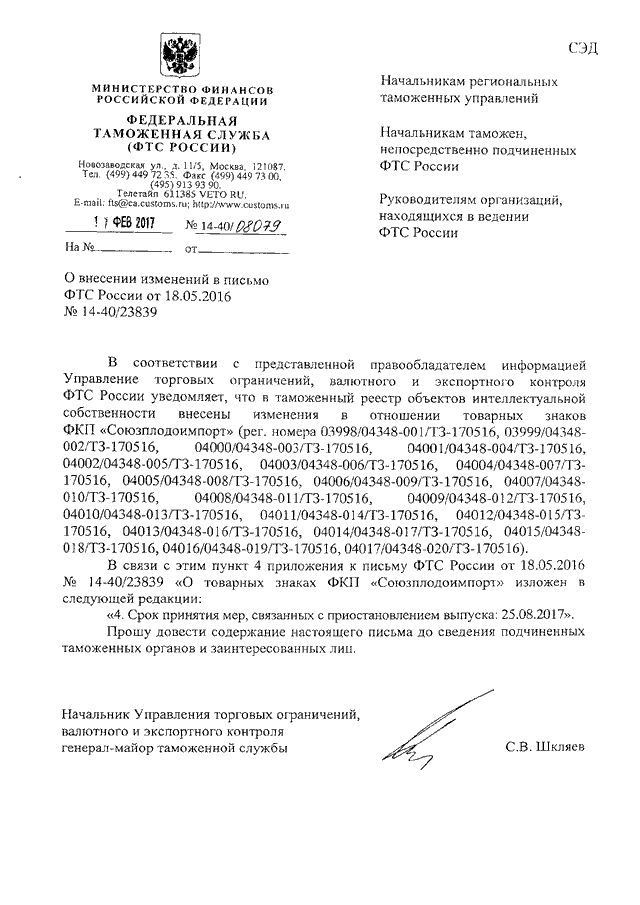 ПИСЬМО ФТС РФ от 17.02.2017 N 14-40/08079