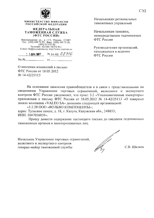 ПИСЬМО ФТС РФ от 22.02.2017 N 14-40/08716