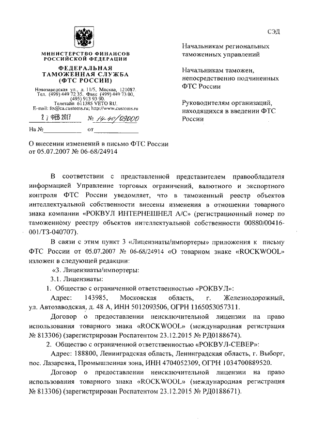 "О ВНЕСЕНИИ ИЗМЕНЕНИЙ В ПИСЬМО ФТС РОССИИ ОТ 05.07.2007 N 06-68/24914"