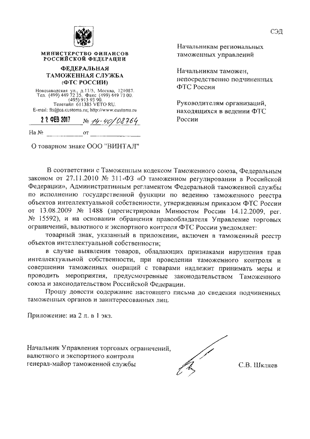 ПИСЬМО ФТС РФ от 22.02.2017 N 14-40/08764