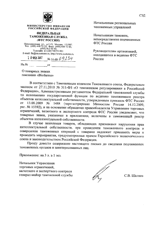 ПИСЬМО ФТС РФ от 28.02.2017 N 14-40/09234