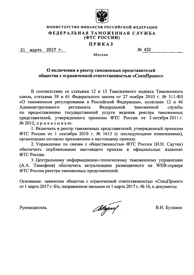 ПРИКАЗ ФТС РФ от 21.03.2017 N 432