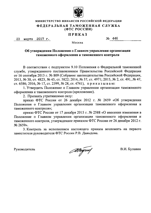 ПРИКАЗ ФТС РФ от 23.03.2017 N 446