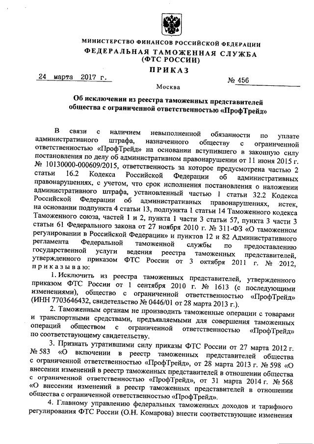 ПРИКАЗ ФТС РФ от 24.03.2017 N 456