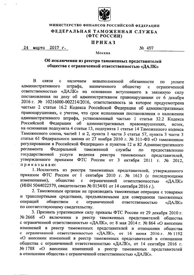 ПРИКАЗ ФТС РФ от 24.03.2017 N 457