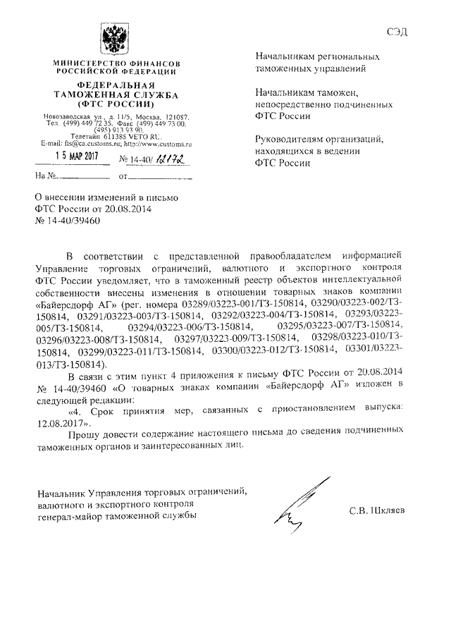 ПИСЬМО ФТС РФ от 15.03.2017 N 14-40/12172