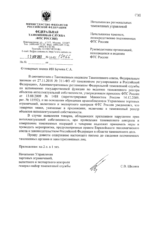 ПИСЬМО ФТС РФ от 07.04.2017 N 14-40/17466