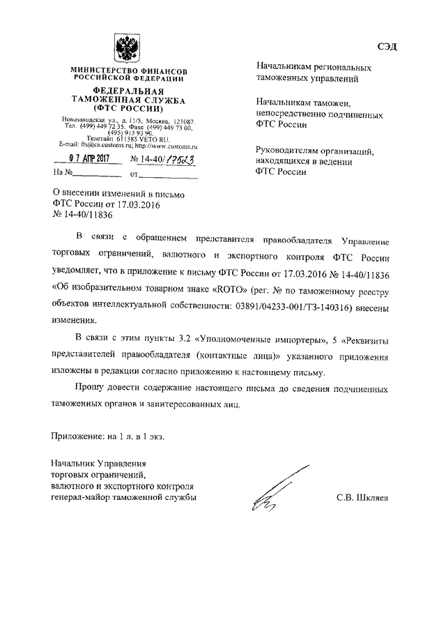 "О ВНЕСЕНИИ ИЗМЕНЕНИЙ В ПИСЬМО ФТС РОССИИ ОТ 17.03.2016 N 14-40/11836"