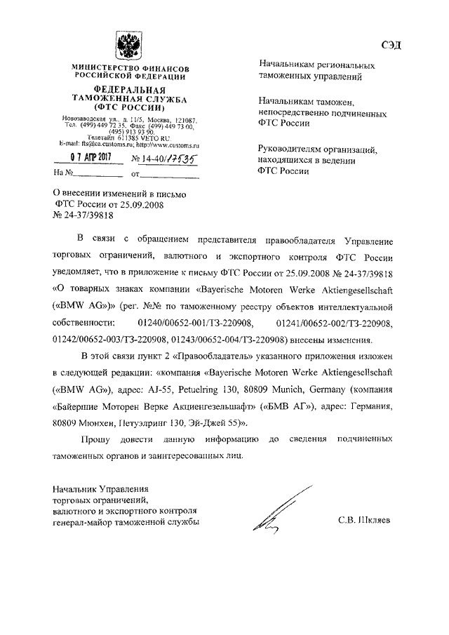 ПИСЬМО ФТС РФ от 07.04.2017 N 14-40/17535