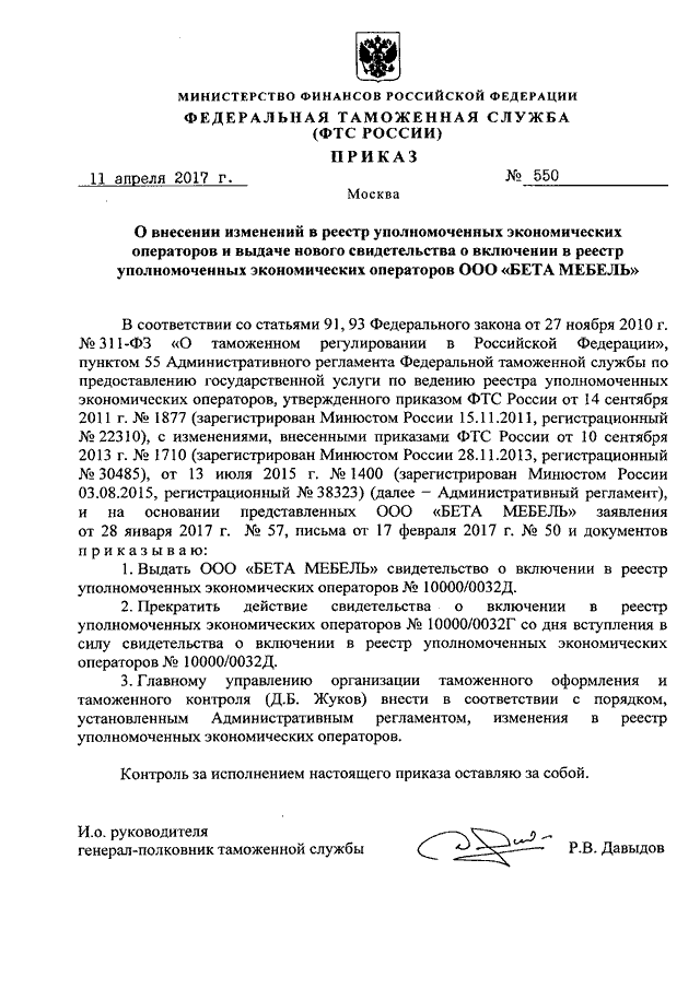 "О ВНЕСЕНИИ ИЗМЕНЕНИЙ В РЕЕСТР УПОЛНОМОЧЕННЫХ ЭКОНОМИЧЕСКИХ ОПЕРАТОРОВ И ВЫДАЧЕ НОВОГО СВИДЕТЕЛЬСТВА О ВКЛЮЧЕНИИ В РЕЕСТР УПОЛНОМОЧЕННЫХ ЭКОНОМИЧЕСКИХ ОПЕРАТОРОВ ООО "БЕТА МЕБЕЛЬ"