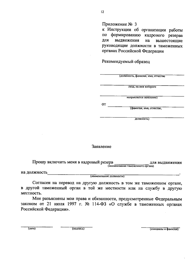 "ОБ УТВЕРЖДЕНИИ ИНСТРУКЦИИ ОБ ОРГАНИЗАЦИИ РАБОТЫ ПО ФОРМИРОВАНИЮ КАДРОВОГО РЕЗЕРВА ДЛЯ ВЫДВИЖЕНИЯ НА ВЫШЕСТОЯЩИЕ РУКОВОДЯЩИЕ ДОЛЖНОСТИ В ТАМОЖЕННЫХ ОРГАНАХ РОССИЙСКОЙ ФЕДЕРАЦИИ"