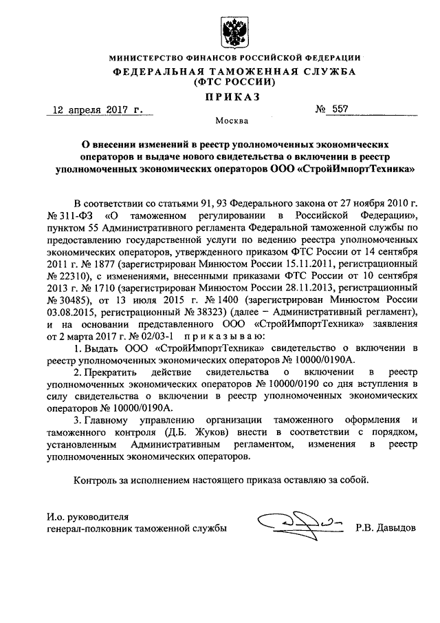 ПРИКАЗ ФТС РФ от 12.04.2017 N 557