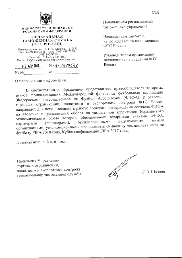ПИСЬМО ФТС РФ от 07.04.2017 N 14-40/17541