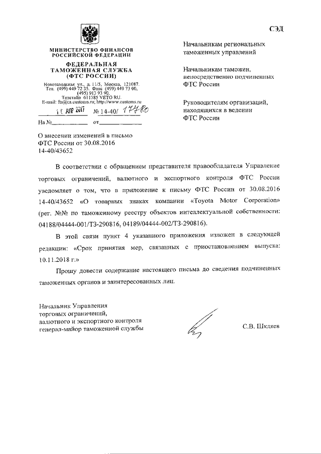 "О ВНЕСЕНИИ ИЗМЕНЕНИЙ В ПИСЬМО ФТС РОССИИ ОТ 30.08.2016 N 14-40/43652"
