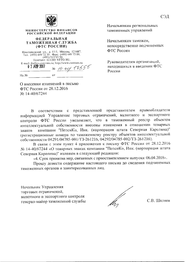 ПИСЬМО ФТС РФ от 07.04.2017 N 14-40/17555