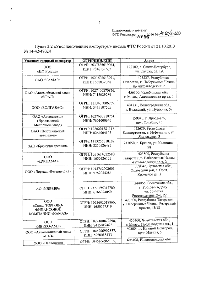 ПИСЬМО ФТС РФ от 11.04.2017 N 14-40/18120