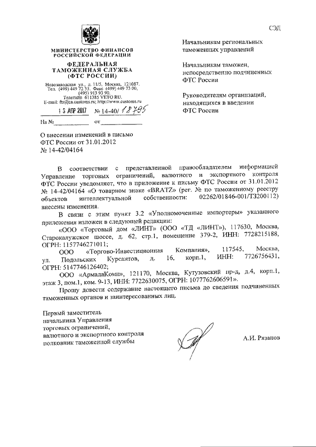 ПИСЬМО ФТС РФ от 13.04.2017 N 14-40/18795