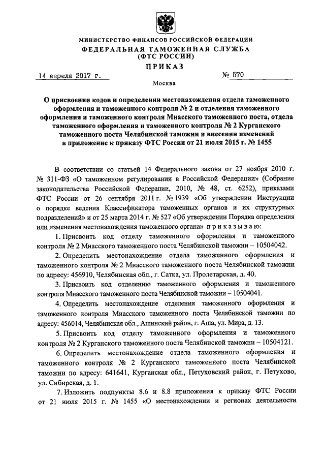 "О ПРИСВОЕНИИ КОДОВ И ОПРЕДЕЛЕНИИ МЕСТОНАХОЖДЕНИЯ ОТДЕЛА ТАМОЖЕННОГО ОФОРМЛЕНИЯ И ТАМОЖЕННОГО КОНТРОЛЯ N 2 И ОТДЕЛЕНИЯ ТАМОЖЕННОГО ОФОРМЛЕНИЯ И ТАМОЖЕННОГО КОНТРОЛЯ МИАССКОГО ТАМОЖЕННОГО ПОСТА, ОТДЕЛА ТАМОЖЕННОГО ОФОРМЛЕНИЯ И ТАМОЖЕННОГО КОНТРОЛЯ N 2 КУРГАНСКОГО ТАМОЖЕННОГО ПОСТА ЧЕЛЯБИНСКОЙ ТАМОЖНИ И ВНЕСЕНИИ ИЗМЕНЕНИЙ В ПРИЛОЖЕНИЕ К ПРИКАЗУ ФТС РОССИИ ОТ 21 ИЮЛЯ 2015 Г. N 1455"