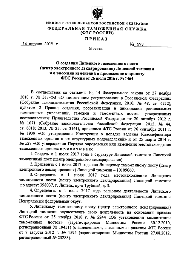 ПРИКАЗ ФТС РФ от 14.04.2017 N 573