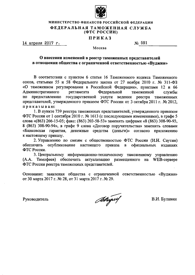 ПРИКАЗ ФТС РФ от 14.04.2017 N 591
