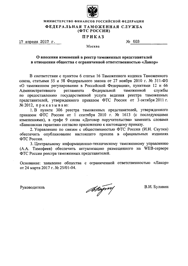 ПРИКАЗ ФТС РФ от 17.04.2017 N 603