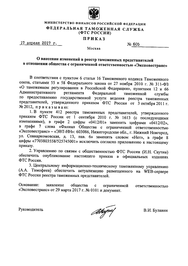ПРИКАЗ ФТС РФ от 17.04.2017 N 605