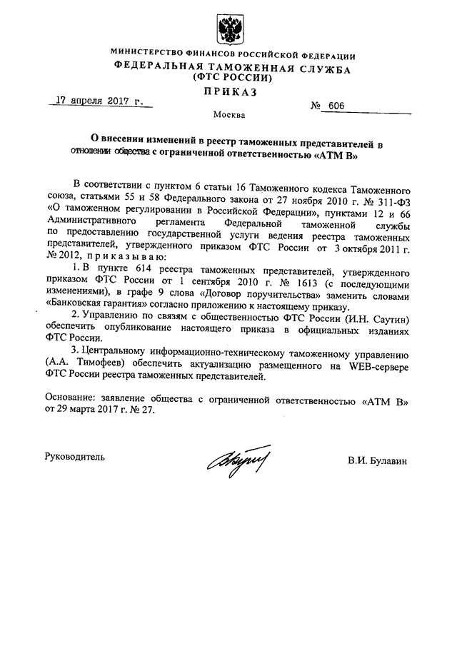 ПРИКАЗ ФТС РФ от 17.04.2017 N 606