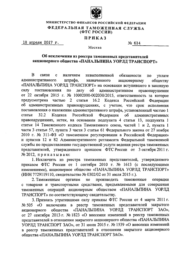 ПРИКАЗ ФТС РФ от 18.04.2017 N 614
