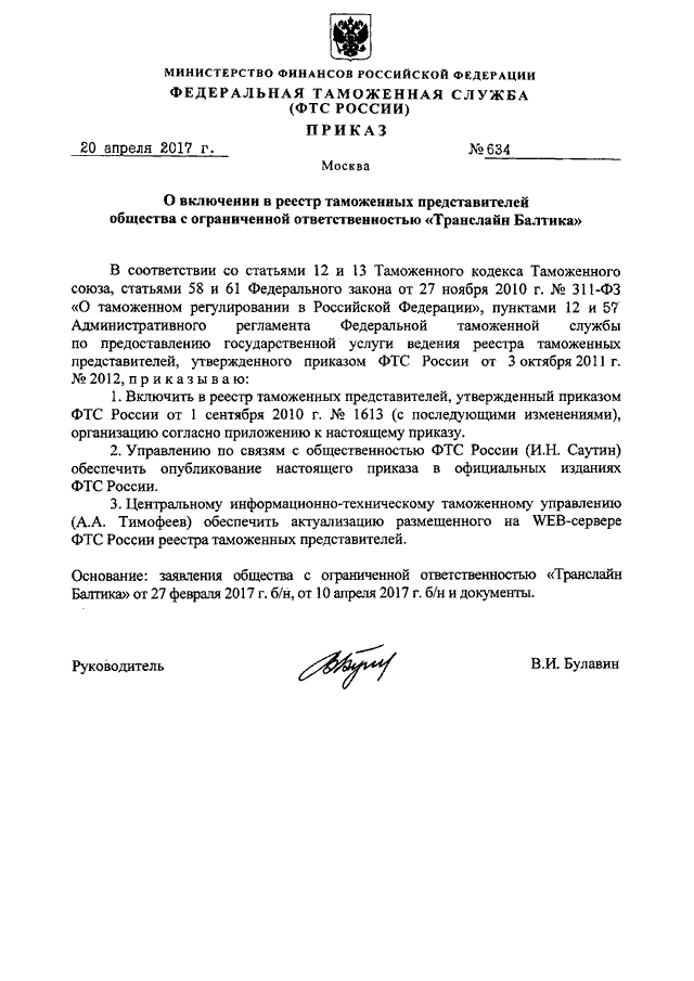 "О ВКЛЮЧЕНИИ В РЕЕСТР ТАМОЖЕННЫХ ПРЕДСТАВИТЕЛЕЙ ОБЩЕСТВА С ОГРАНИЧЕННОЙ ОТВЕТСТВЕННОСТЬЮ "ТРАНСЛАЙН БАЛТИКА"
