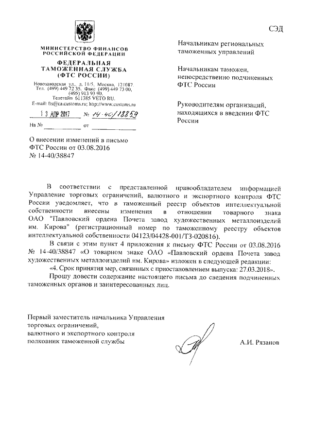 ПИСЬМО ФТС РФ от 13.04.2017 N 14-40/18859