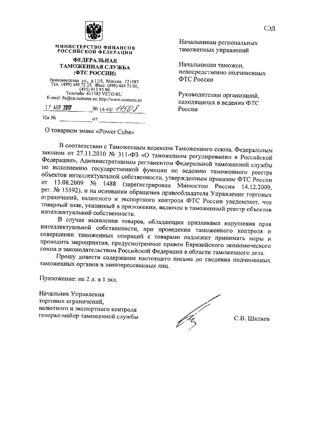 ПИСЬМО ФТС РФ от 17.04.2017 N 14-40/19508