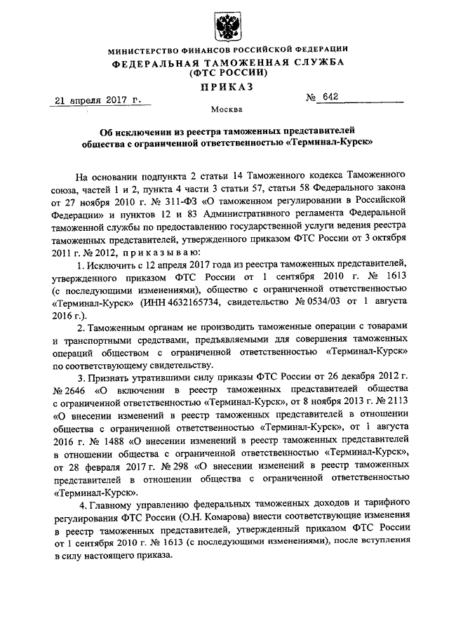 ПРИКАЗ ФТС РФ от 21.04.2017 N 642