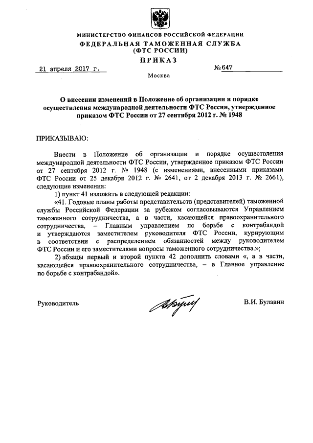 ПРИКАЗ ФТС РФ от 21.04.2017 N 647