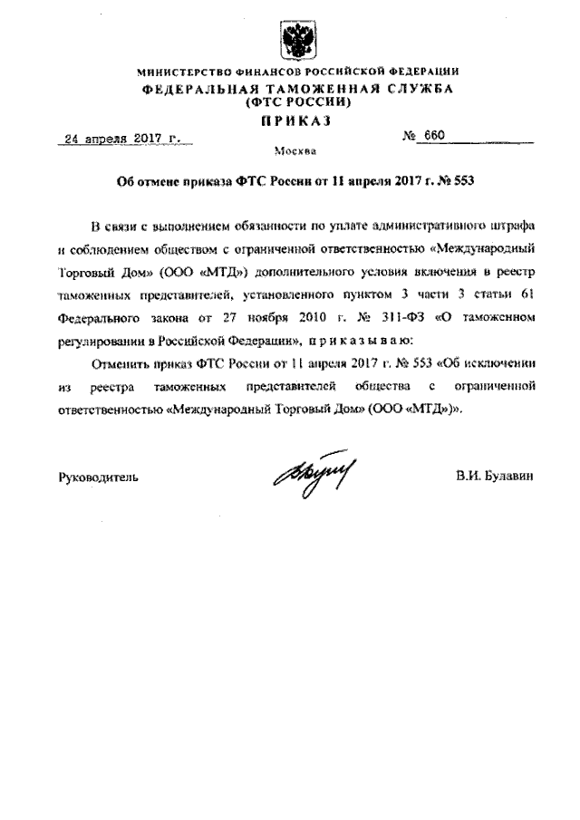 ПРИКАЗ ФТС РФ от 24.04.2017 N 660