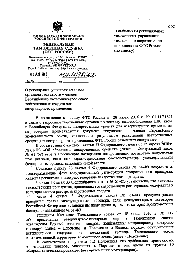 ПИСЬМО ФТС РФ от 03.08.2016 N 01-11/38662