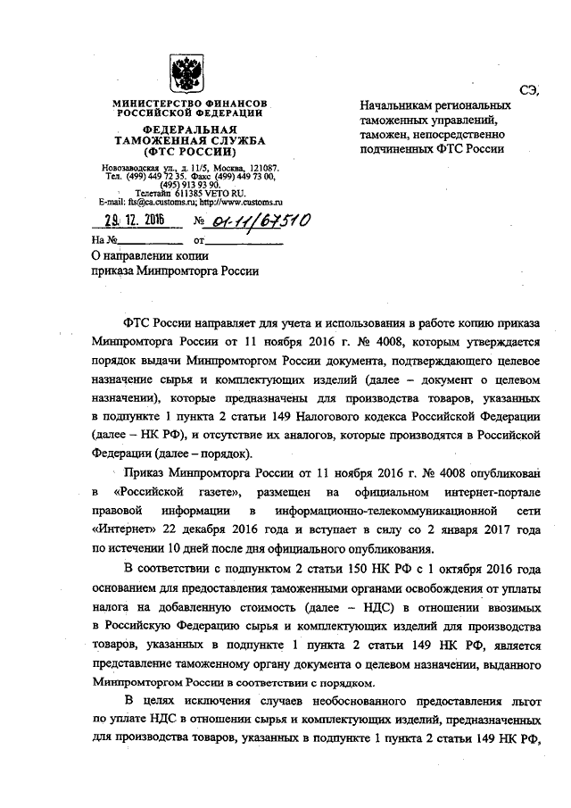 "О НАПРАВЛЕНИИ КОПИИ ПРИКАЗА МИНПРОМТОРГА РОССИИ"