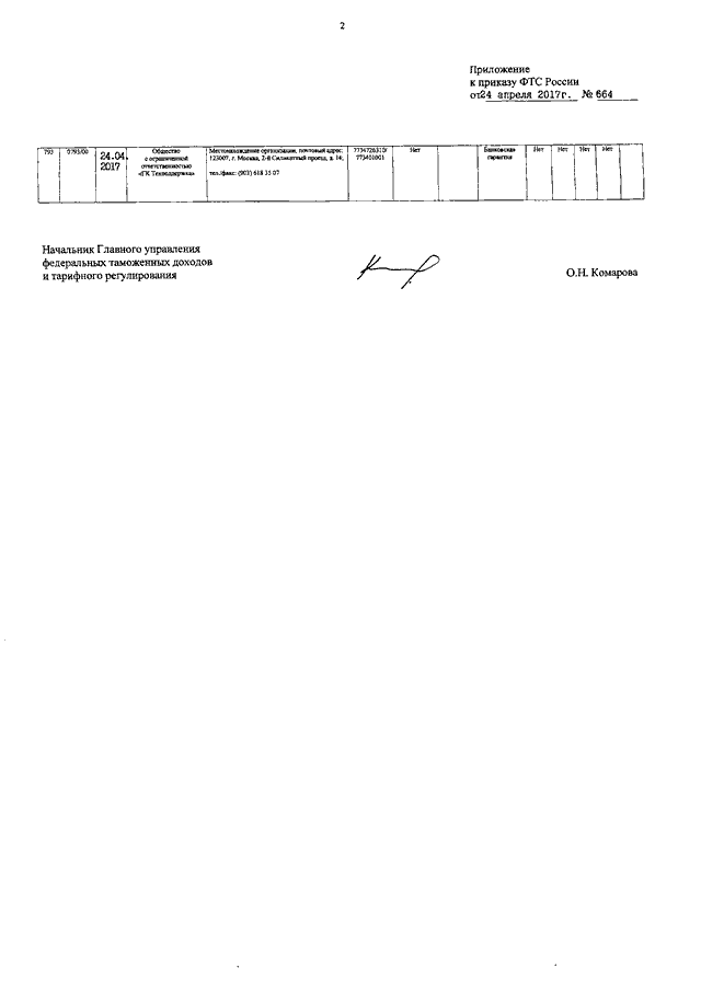 ПРИКАЗ ФТС РФ от 24.04.2017 N 664