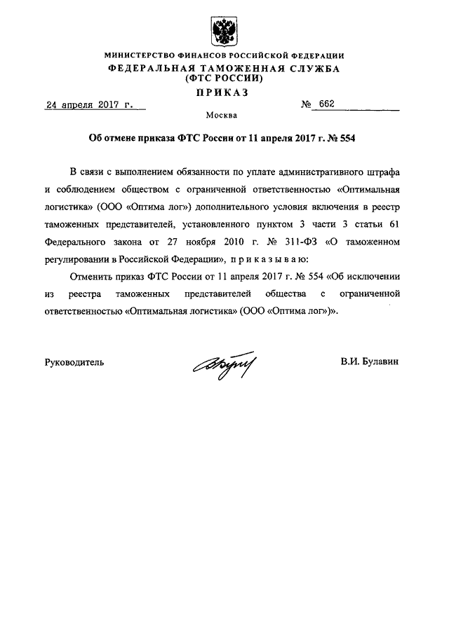 "ОБ ОТМЕНЕ ПРИКАЗА ФТС РОССИИ ОТ 11 АПРЕЛЯ 2017 Г. N 554"