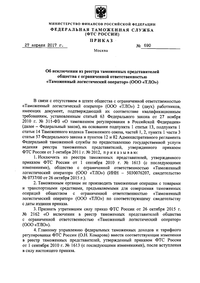 ПРИКАЗ ФТС РФ от 27.04.2017 N 690