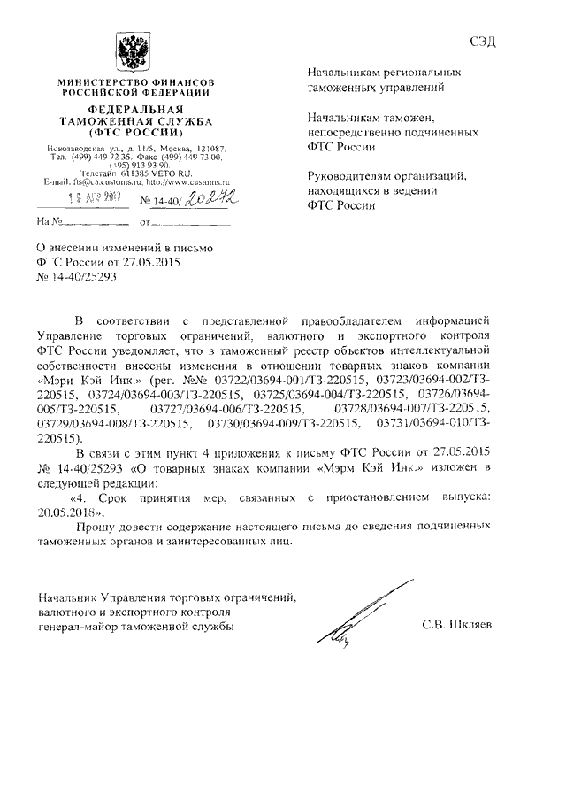 "О ВНЕСЕНИИ ИЗМЕНЕНИЙ В ПИСЬМО ФТС РОССИИ ОТ 27.05.2015 N 14-40/25293"