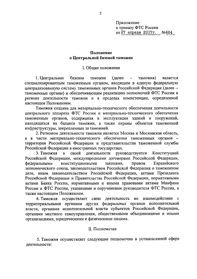 ПРИКАЗ ФТС РФ от 27.04.2017 N 684