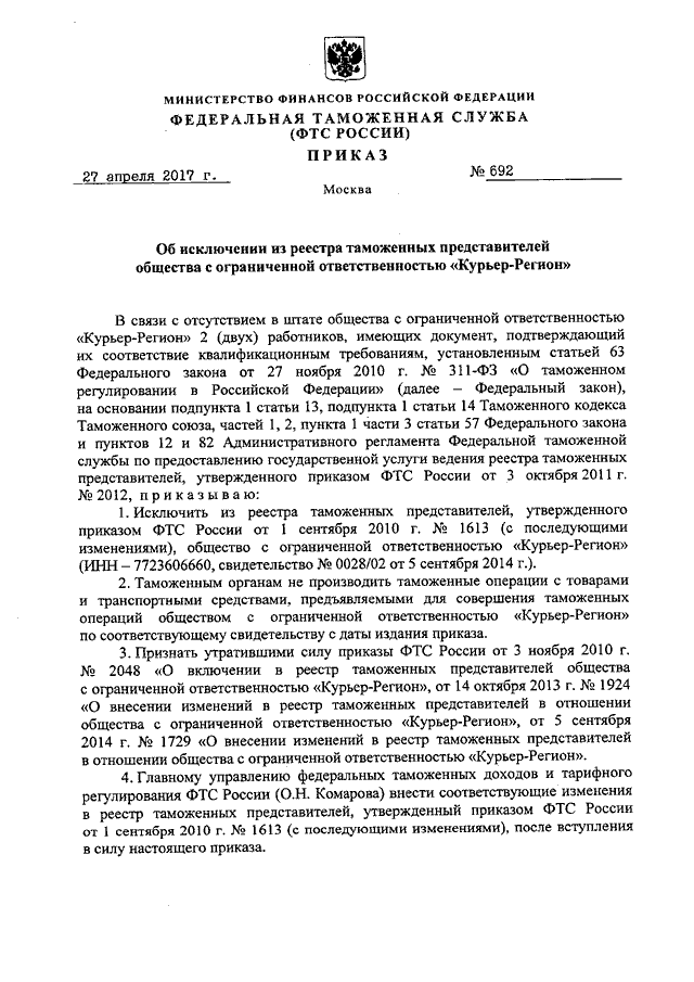 ПРИКАЗ ФТС РФ от 27.04.2017 N 692