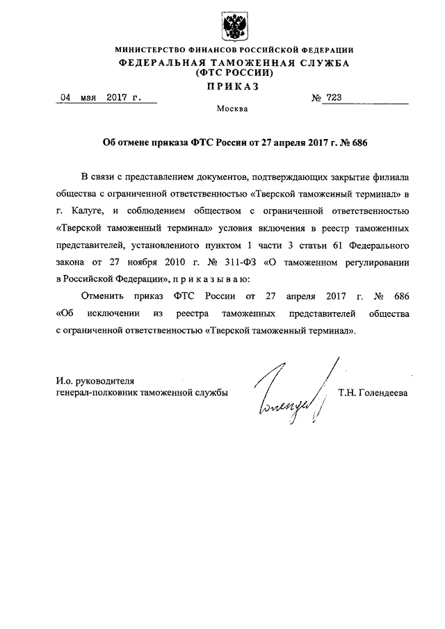 "ОБ ОТМЕНЕ ПРИКАЗА ФТС РОССИИ ОТ 27 АПРЕЛЯ 2017 Г. N 686"